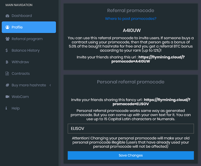 1. Register at FlyMining with a promocode LIUT987 and get a promo link at the "Profile" page